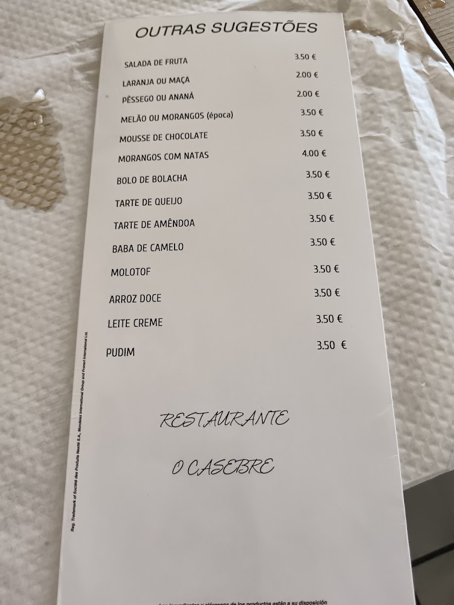 The menu at Restaurante Casebre-Investimentos Hoteleiros Lda offers a delightful array of traditional Portuguese dishes, each packed with rich flavors and made from fresh, local ingredients. For those seeking a hearty meal, Bacalao O Casebre stands out as a signature dish, bringing together the perfect combination of salted cod with a unique twist, while Bacalao Con Broa offers a more rustic option, with the cod paired with corn bread for a satisfying bite. If you’re in the mood for something lighter, the Salad is a refreshing choice, featuring a blend of fresh vegetables and simple, flavorful dressings. The grill menu features the Pollo A la Parrilla, a perfectly cooked grilled chicken, which is a favorite for meat lovers. For dessert, Tarta de la Abuela is an indulgent treat, offering a traditional Portuguese-style cake that brings a sweet end to the meal. Another surprising delight on the menu is Caracolillos, a dish that showcases the richness of local flavors. Overall, Restaurante Casebre's menu provides an authentic taste of Portugal, with options that cater to all preferences, ensuring a memorable dining experience.